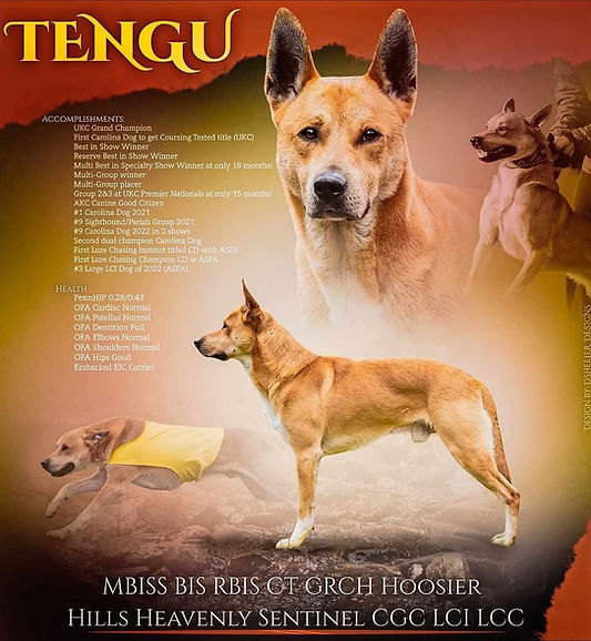 Tengu is the half sibling to our foundation female, Juke Box. Tengu was the first male Carolina Dog to achieve Dual championship status by obtaining a conformation championship in UKC and a lure coursing championship in ASFA. Tengu was the first Carolina Dog to earn a UKC lure coursing title, as well as the only Carolina Dog to hold the LCC title in ASFA lure coursing. Tengu is known for his confidence and good looks alike. He is a proven producer and has contributed to the genepool in way of conformation champions and successful athletes. With excellent manners around dogs of all kinds and a temperament that makes hearts melt, Tengu has a lot to offer the Carolina Dog breed. Tengu will be making his AKC sport and conformation debut in Spring 2026.